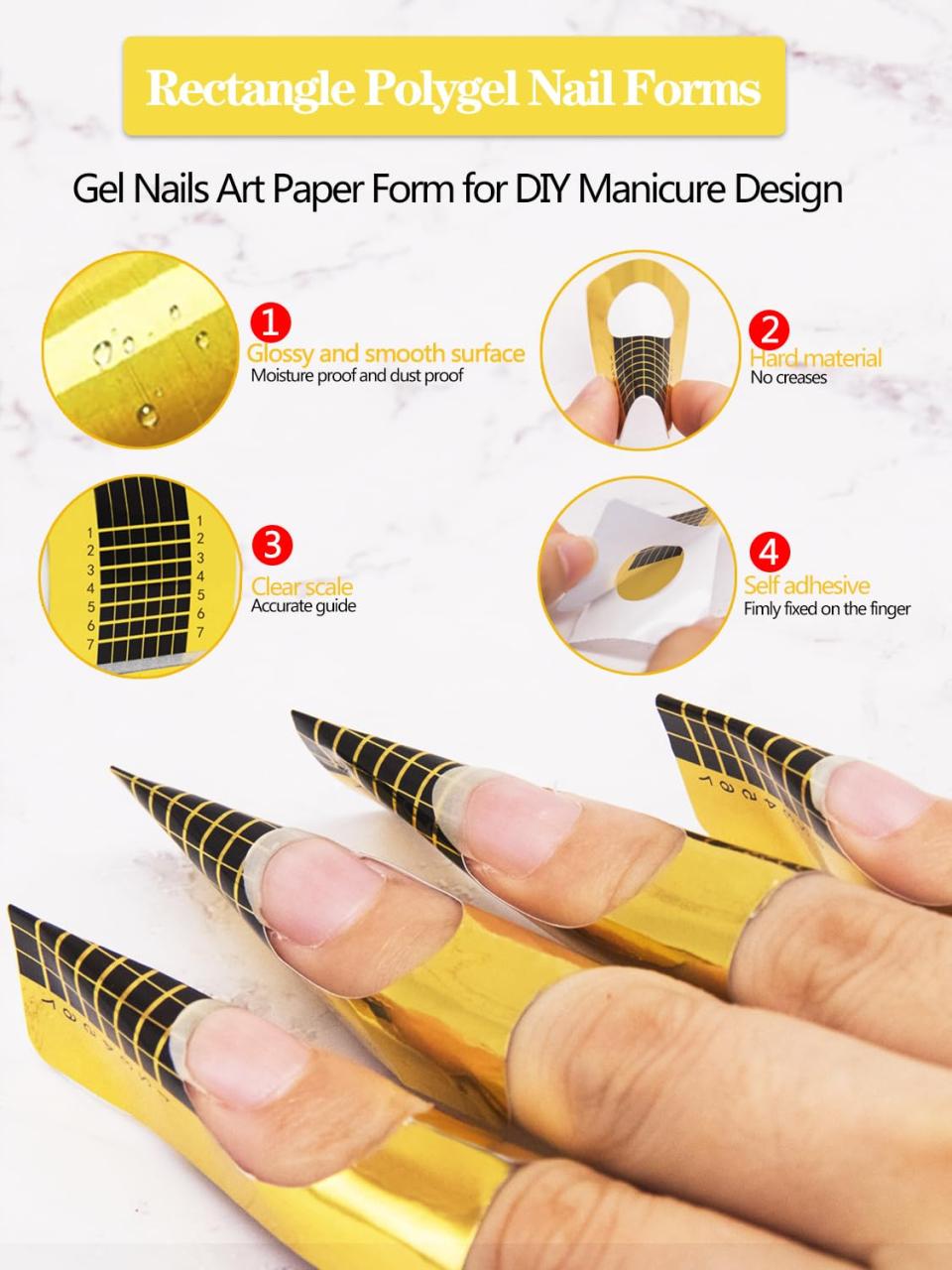 High Quality Square Nail Forms: Nail forms is thickness enough not easy to deform.Glossy lamination surface and self-adhesive with good adhesion, polygel nail forms fixed on your finger,not easy to fall behind the finger. Come with 200 pieces rectangle nail extension tips,sufficient quantity for multiple nail art sessions.